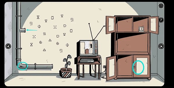 3、接着向左走去,拿走架子上的「笔记本」和花盆里的「石头」。之后,认真查看它们上面的提示,将得到的纸条放在对应的位置。按照笔记本的提示,打开下方的柜子(注意符号顺序会有所改变),进而拿到「镜子」。