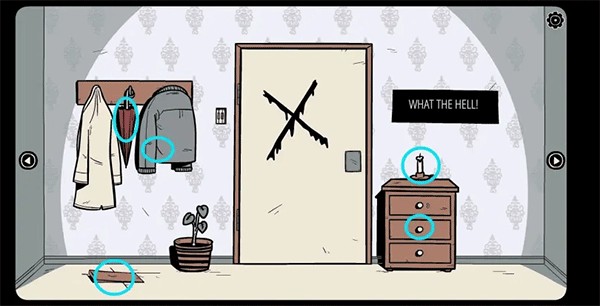 9、行至门口,用钥匙开启抽屉,拿走其中的「手套」。之后,拿起玻璃碎片划破右边墙上的壁纸,紧接着按照壁纸背后的提示,打开被木板封住的门左侧的柜子,取得「钥匙」与「开关」。