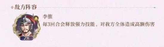 敌方阵容:李催(每3回合会释放强力技能,对我方全体造成高额伤害)