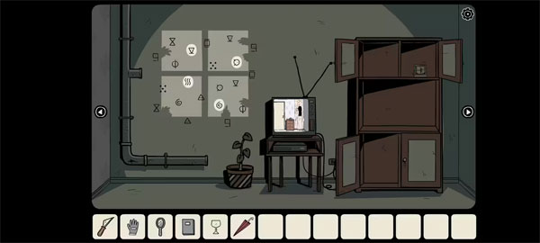 不知何时,房门旁的矮柜上已然出现了那个旋钮。你将其拿走,接着顺手用酒瓶里的钥匙打开抽屉,从中获得了绝缘手套。随后,你把旋钮安装到电视机上,刹那间灵感突发,依照录像中呈现的那样,把两个旋钮旋转到画面里圆圈与横线相对应的位置,进而得到了一个把手。