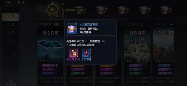 在日常委托中,若当天活跃度达到40,就能领取二阶段奖励,其中包含1个体力药(10)。