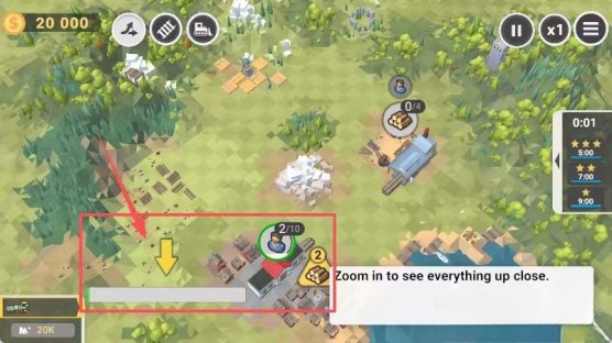4.点左上角金币查看余额,用箭头缩放画面,操控蓝色车辆运载木材完成运输任务。