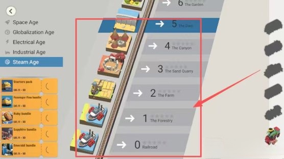 2.选左侧蒸汽时代等不同时代背景,点右侧编号0-6区域查看铁路对应场景内容。