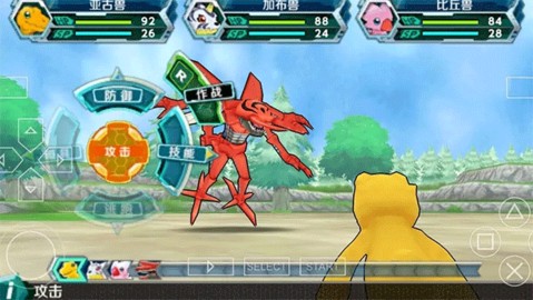 1、打开游戏,在战斗界面中,屏幕下方设有进度条显示。左下角L键功能为“进化”(仅当数码宝贝可进化时使用),右上角R键则为“更改作战方案”(此功能在实际游戏中作用有限)。