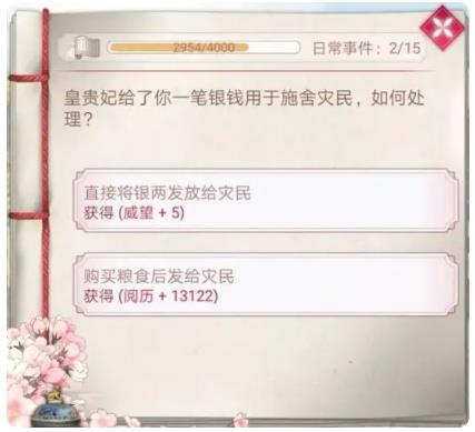 萌新前期建议优先选择各类散、丸(积攒起来,等剧情关卡过不去时,再消耗气势属性的散丸提升具有气势特长的伙伴,药水可不选);其次选择威望值,由于巡宫里多数玩法以及办差时委派伙伴,都要达到相应身份才能解锁,因此要尽快晋升身份,解锁玩法并增加收益。