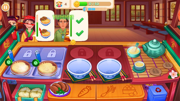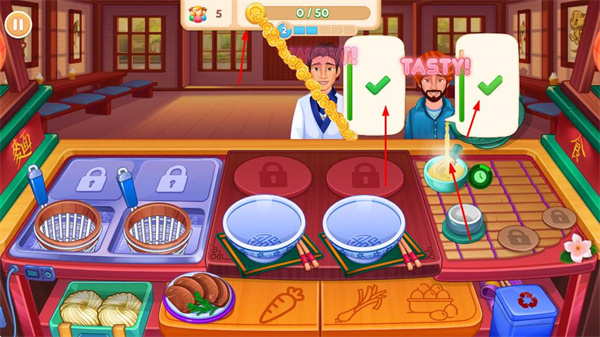 3、把制作完成的食物提供给顾客,顾客感到满意后,会给出如TASTY、YUMMY这类评价,同时顾客能获得金币奖励,积累金币数量。