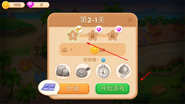 1. 在关卡选择页面,能够挑选像第2 - 1关之类的关卡,点击“开始游戏”即可进入。此外,还能借助升级功能来提升餐厅设施,并且可以使用助推器辅助游戏。