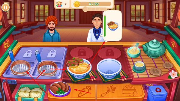 2、当进入餐厅场景,若顾客订单中有包含肉丸的面食,就在厨房准备食材,并使用蒸锅等厨具来制作食物。