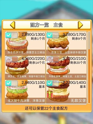创意汉堡物语中的汉堡有多种类型,每种汉堡的配方都不一样。