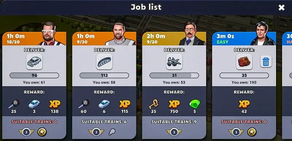 游戏会给您安排任务,也可叫做“工作”。大体上,您得向它们供应一定数量的特定商品。此项任务并无时间限制,不过部分工作需要特定类型的机车。从上方的屏幕截图中您能看到,有些工作显示“无合适火车”,这表明我手头没有任何符合要求类型且处于空闲状态的机车(史诗级)。