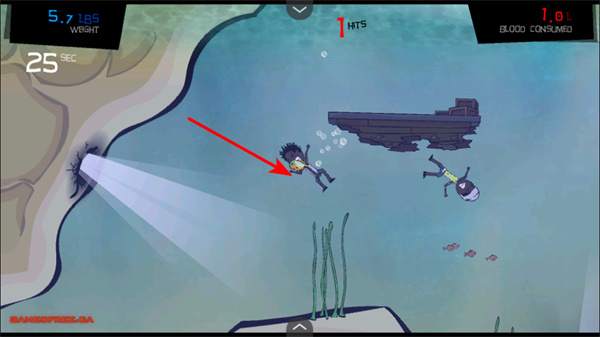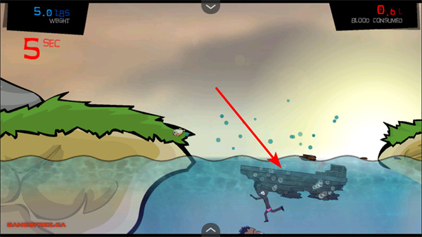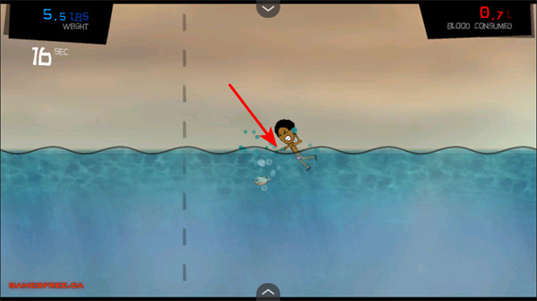 3、捕食小鱼,操控角色在水域中捕食人类,不断积累体重,还有机会获取血液资源,以用于升级。