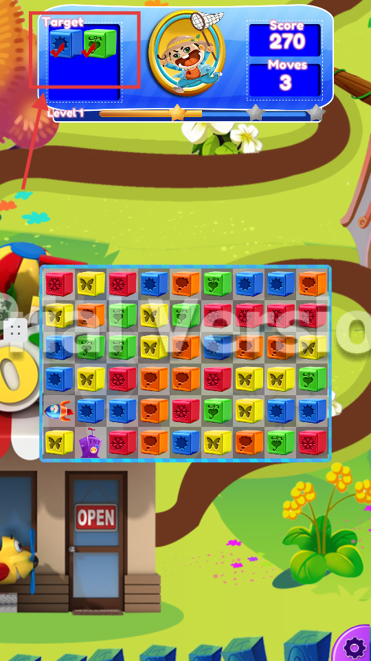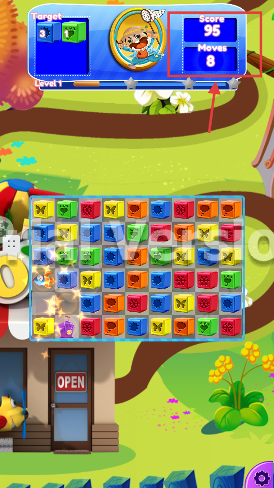 2、留意右上角【Score】-【Moves】,根据步数来规划消除操作,优先处理能高效得分的方块或者目标方块。