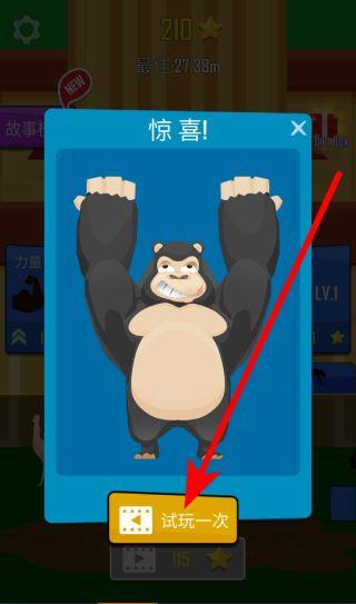 4、你还可以通过观看视频试玩诸如金刚猩猩这类新角色。这些新角色拥有独特的抛飞能力,尝试不同角色能为你带来全新的体验,帮助你突破抛飞距离的瓶颈。