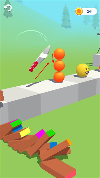 1. 操控飞刀实施投掷动作,以击中场景内的物体为目标,像堆叠起来的橙色球体、带有图案的立柱之类。在投掷飞刀的过程中,需留意角度与力度。
