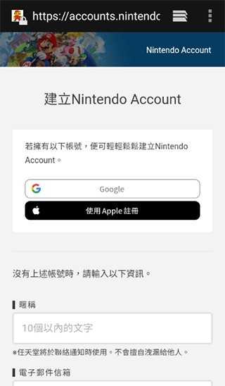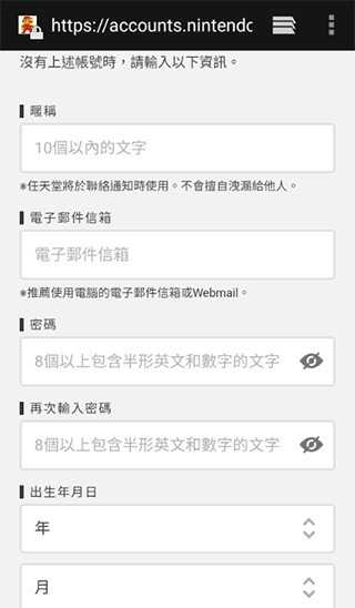 5、你还能够手动创建一个全新的Nintendo Account,在填好昵称、邮箱等相关信息后,点击确认提交,如此便能完成注册并顺利进入游戏主界面。