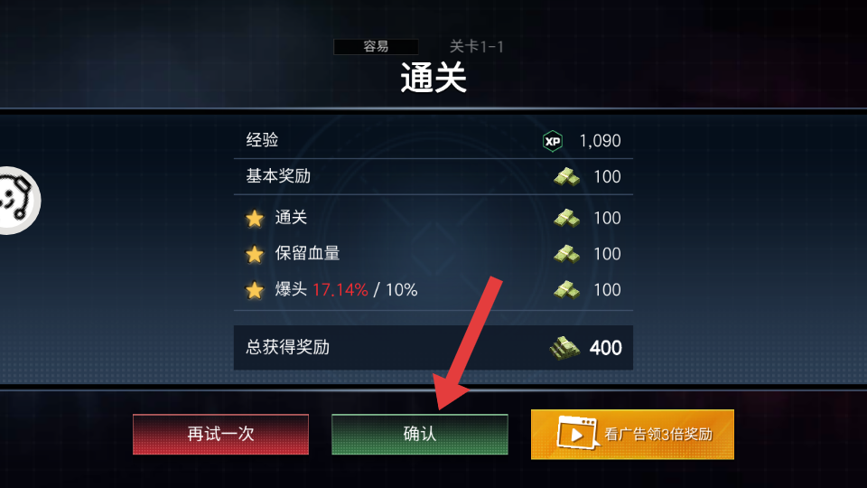 4、顺利通关后,查看奖励详情,点击【确认】按钮,即可选择继续挑战后续关卡,或者开展其他操作。