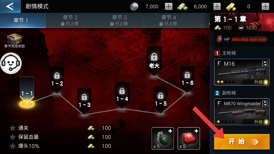 1. 在【剧情模式】的【第1 - 1章】界面,仔细确认枪械等装备状况无误后,点击【开始】按钮,从而进入关卡。