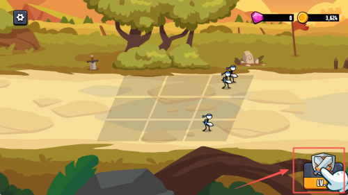 4、在游戏进行时,若看到右下角出现盾牌图标,点击该图标即可升级部队。需留意,左上角的齿轮代表设置,右上角的3624为金币数量。
