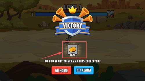 2、当胜利界面弹出“VICTORY”标志时,若想领取624金币,就点击蓝色的“CLAIM”按钮;若想返回主页,则点击红色的“GO HOME”按钮。
