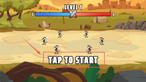 1、当你看到第一关界面以及蓝红血条时,径直点击底部红框内的按钮来开启游戏,同时要留意血条数值均为3 。