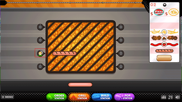 3、首先,把热狗放置在烤炉上,留意左侧指针的颜色变化。一旦指针变为橙色,就再次点击热狗,给它翻面。(要特别注意,别让热狗烧焦了。)