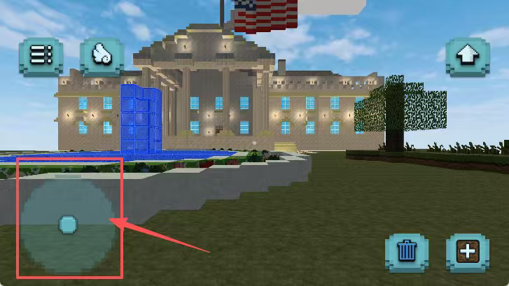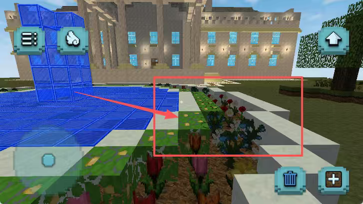 2. 观察像素风格的建筑画面,点击左下角红框内的圆形物体,这一操作或许是针对建筑前方的水池区域。