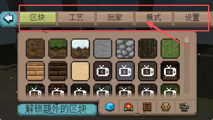 4、查看游戏界面的截图信息,点击蓝色中文以解锁额外区块,也可以选择标签或方块进行建造。