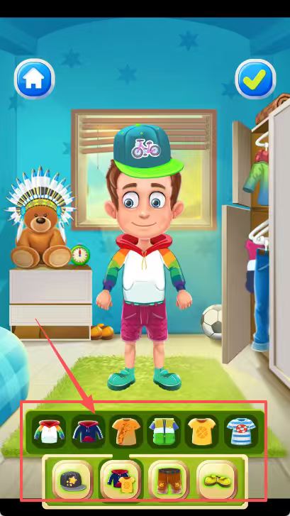 4、在充满卡通风格的房间中,有一个戴着绿色帽子的男孩,他站在有着蓝色星星图案的墙壁前。男孩的身后摆放着小熊玩偶和水果。房间的下方设有服装选项。而在画面的左上角,是一个蓝色房子形状的按钮,右上角则是蓝色的对勾按钮。