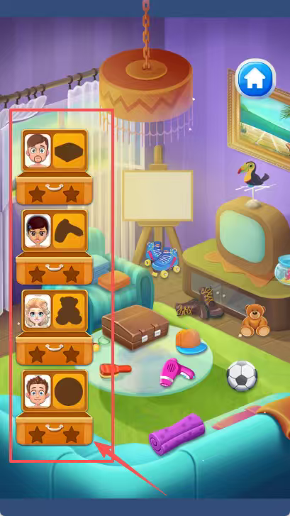 3、在室内场景中,左侧呈现出四张带有人物头像与星星的行李箱图标,右侧则是一间紫色墙壁的房间,里面挂着画、摆放着电视机等物品,大家可直接观察这些丰富的布置。
