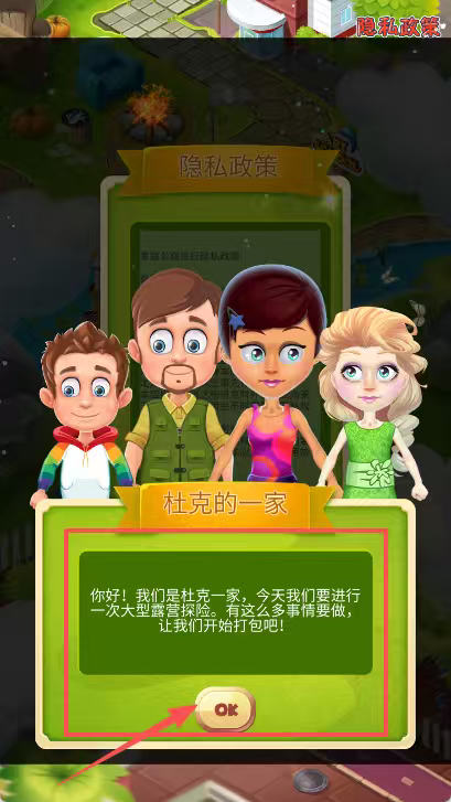 1. 开启游戏,杜克一家四口受到邀请去参加露营探险,出现绿色对话框提示该打包了,此时直接点击ok按钮,即可着手进行露营准备。