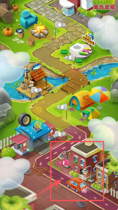 2、在卡通风格的城镇画面里,那座被红框标注的砖红色两层建筑前方,停放着一辆橙色的小车。画面的左上角,有一家蓝色的带轮店铺;右上角的休闲区域,则摆放着露营帐篷等物品。