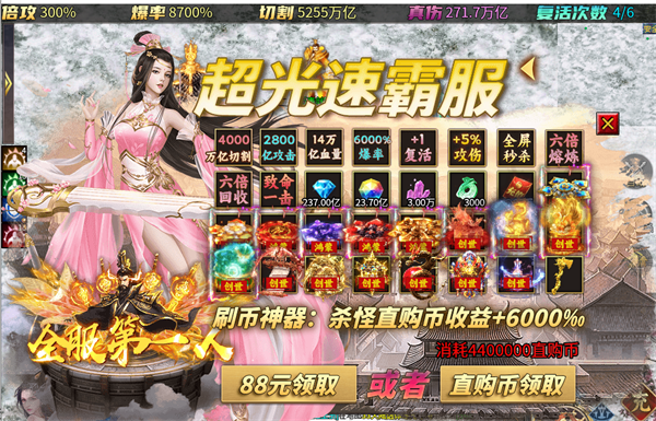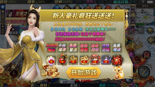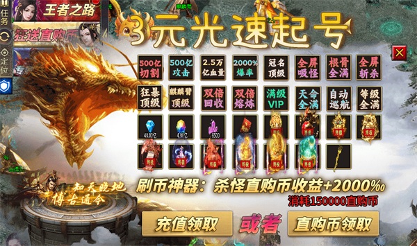 1、充值比例1:1,上线即可领取万亿切割、范围嘲讽技能,角色还能直接直升9999级!