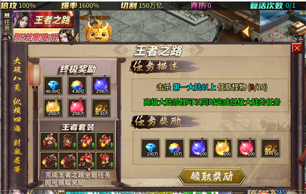 只要完成王者之路的全部任务,就能领取奖励。在前期,我们所需提升的项目,都有对应的 NPC 分布在每个大陆的安全区周边。把领到的材料全部用于提升,直至升满,便可进入下一大陆。要是材料不够了,别担心,直接前往地图打怪就行。所有用于提升的材料,都能通过打怪获取,而且爆率相当高!