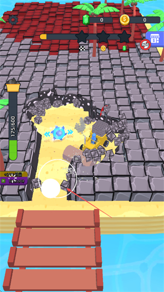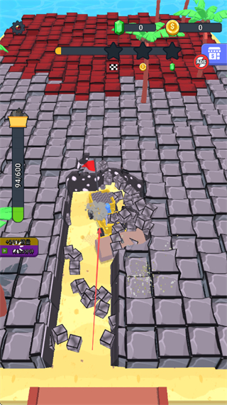 1、操控挖掘机在由灰色石块组成的区域挖掘,击碎石块,收集其中的金币和资源。