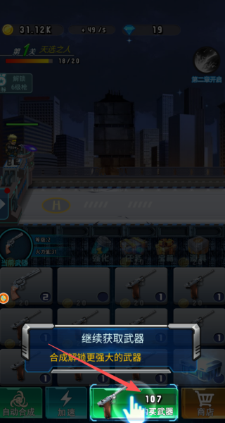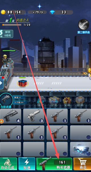 1游戏开启之际,第一步先购置基础武器,后续持续积累同类型武器,如此便可合成等级更为高级的强力装备。