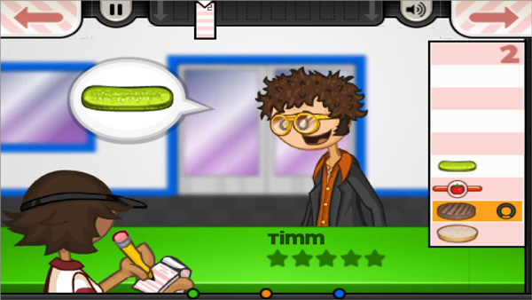 4、接着把小票拖至订单夹,同时将汉堡递给顾客,根据顾客评分给予对应的金币。