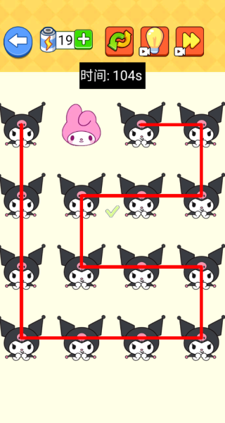 1. 在第一关中,需要躲开粉色兔子,接着用一根线把全部酷洛米连接起来,按照图中的路线绘制即可。