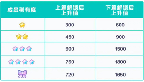8、当解锁“上篇”且完成首次观看后,成员综合力会提升固定点数,同时还能获得25个水晶作为角色剧情奖励。而解锁“下篇”并完成首次观看后,成员综合力同样会提升固定点数,且可获得50个水晶的角色剧情奖励。要解锁“下篇”,需先对成员进行特训直至提升至满级,并且要观看完“上篇”。每篇角色剧情的奖励仅能获取一次,解锁角色剧情后成员综合力增加的数值为: