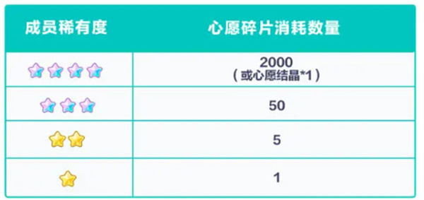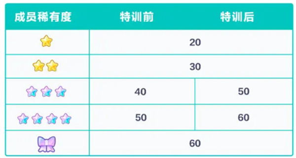 8、每位成员都能够使用道具“心愿碎片”或者“心愿结晶”来进行最多5次的专家特训。完成专家特训后,成员的综合力将会得到提升。而且,不同稀有度的成员所能获取的专家等级报酬也有所不同。当对附带演出服装的4星成员开展专家特训时,不仅能够提升其综合力,还能够解锁该演出服装的全新颜色,解锁后还能够在服装商店为其他角色制作同款颜色的服装。以下是各稀有度成员专家等级每提升1级所需的道具数量: