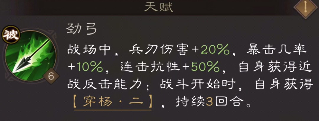 接下来,每位武将还有天赋设定,这在不少同类型游戏中颇为常见。天赋与技能是决定一个角色不可替代的关键因素。就像上图展示的新手可自选获得的5星武将黄忠的天赋,除了兵刃增伤、暴击提升、连击抗性增强外,关键在于近战反击能力。鉴于黄忠属于弓骑兵职业,本身不具备近战1格输出能力,而这个天赋能力的存在,使黄忠走位更加从容。并且在战斗开始3回合内,黄忠还能额外获得30%的兵刃增伤,如此一来,战斗开始3回合内他总计能获得50%的兵刃增伤,这无疑是一个非常强力的增益效果。