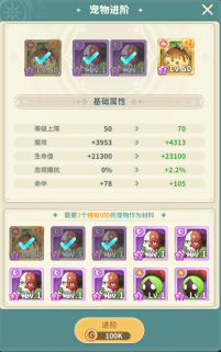 当宠物达到特定等级后,能够消耗指定宠物进行进阶操作,完成进阶后,宠物的等级上限将会得到提升。