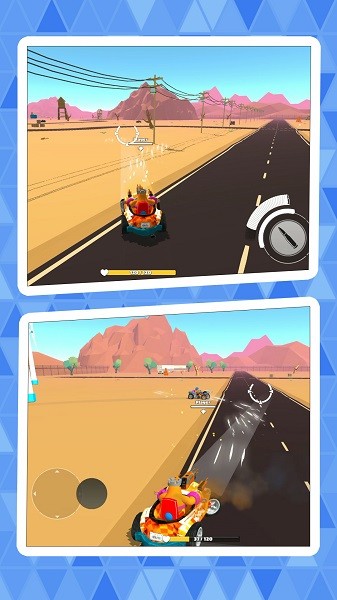 1、尽情开启飙车挑战的冒险之旅,广袤的沙漠战场任你自由探索。