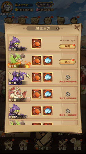 3、此时到了魔王巢穴的时间段了,这里有一个很关键的点,不要先全部扫荡了,优先升级,看升级不动了,在去把解锁好的魔王巢穴全部打完,再去扫荡了,不然会面临明明已经打到了最高的boss了,但扫荡用在了第一个首领,白白浪费了好几个战斗次数。