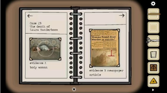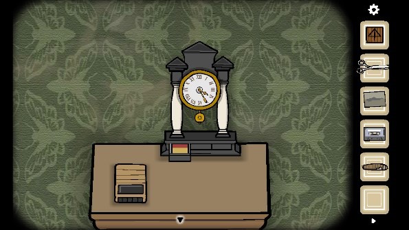 13、连续点击两次钥匙孔,随即出现眼睛。仔细观察眼睛上图案所处的位置,接着将时钟的指针转动到十二点四十五分。此时暗格开启,从中获取「三角形钥匙」。使用这把钥匙打开右边的抽屉,可得到「胶片2」与「手帕」。再打开左边的抽屉,里面满是各种文件夹,其中包含书架上书摆放位置的提示信息以及一个「文件」 。