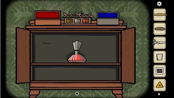 18、当点击毛毛虫,待其吃掉叶子化成飞蛾后,前往沙发位置。在沙发处,使用剪刀剪开沙发,从而获取「线」。接着拿走杯子,把文件柜上瓶子里的液体用杯子盛装起来,然后将这些液体倒入第一个瓶中。随后,把线绑在瓶塞上,再放上钩子,如此便可获得「绿色眼球」
