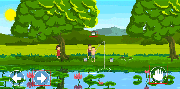 2、选择帮大宇钓鱼,接着继续向右移动至鱼竿位置,当鱼竿上方出现对话图标时,点击右下角的手印,随即开始钓鱼。