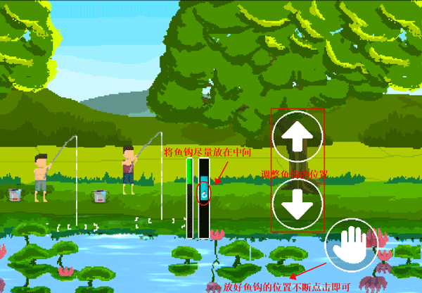 3、开启钓鱼小游戏后,可把鱼钩放置在中间位置,接着静静等待方块移动至指定位置,玩家只需持续点击右下角按钮来增加钓鱼值。钓到三条鱼之后,再与大宇进行对话,随后三人便开始玩木头人游戏。