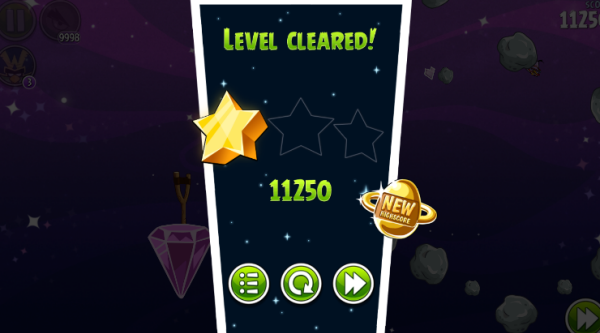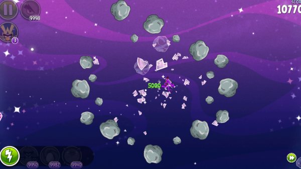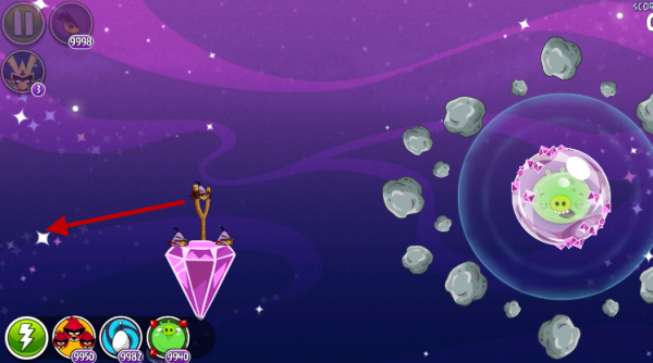 太空穿梭鸟(原黄色的三角形鸟)拥有非同凡响的天赋,当它被发射到中途的时候,轻轻点击一下屏幕,它就会进行直线式的冲刺攻击!犹如导弹一般,以恐怖的速度冲向绿猪,威力极大!不过,加速的时机很难掌握,否则很可能会飞出打击目标,无法制造精确打击。但一旦掌握好使用方法,愤怒的小鸟就会真正地愤怒起来,给木质结构的猪堡制造极大的破坏。