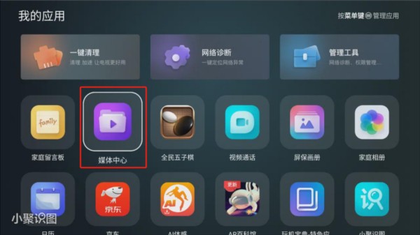 5、回到我的应用中,点击【媒体中心】。