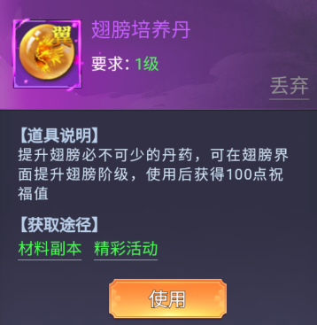 提升翅膀必不可少的丹药,可在翅膀界面提升翅膀阶级,使用后获得100点祝福值;